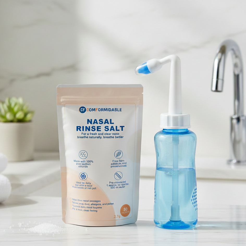 Met het nasaal spoelzout van Comformidable reinig je je neus eenvoudig en grondig. Dit zuivere spoelzout is speciaal ontwikkeld om te gebruiken met een neusdouche en helpt bij het verlichten van een verstopte neus door verkoudheid, hooikoorts of allergieën. Perfect voor wie op zoek is naar een effectieve manier om de neus te reinigen en vrij te houden.