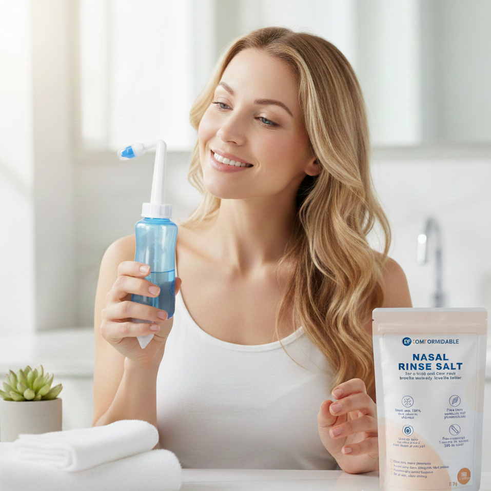 Gebruik het nasaal spoelzout met de Comformidable neusdouche