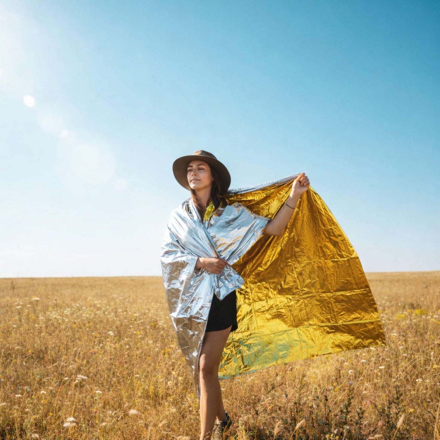 Een nooddeken houdt je warm of koel, beschermt tegen wind en regen en kan dienen als EHBO‑folie om open wonden af te schermen.
